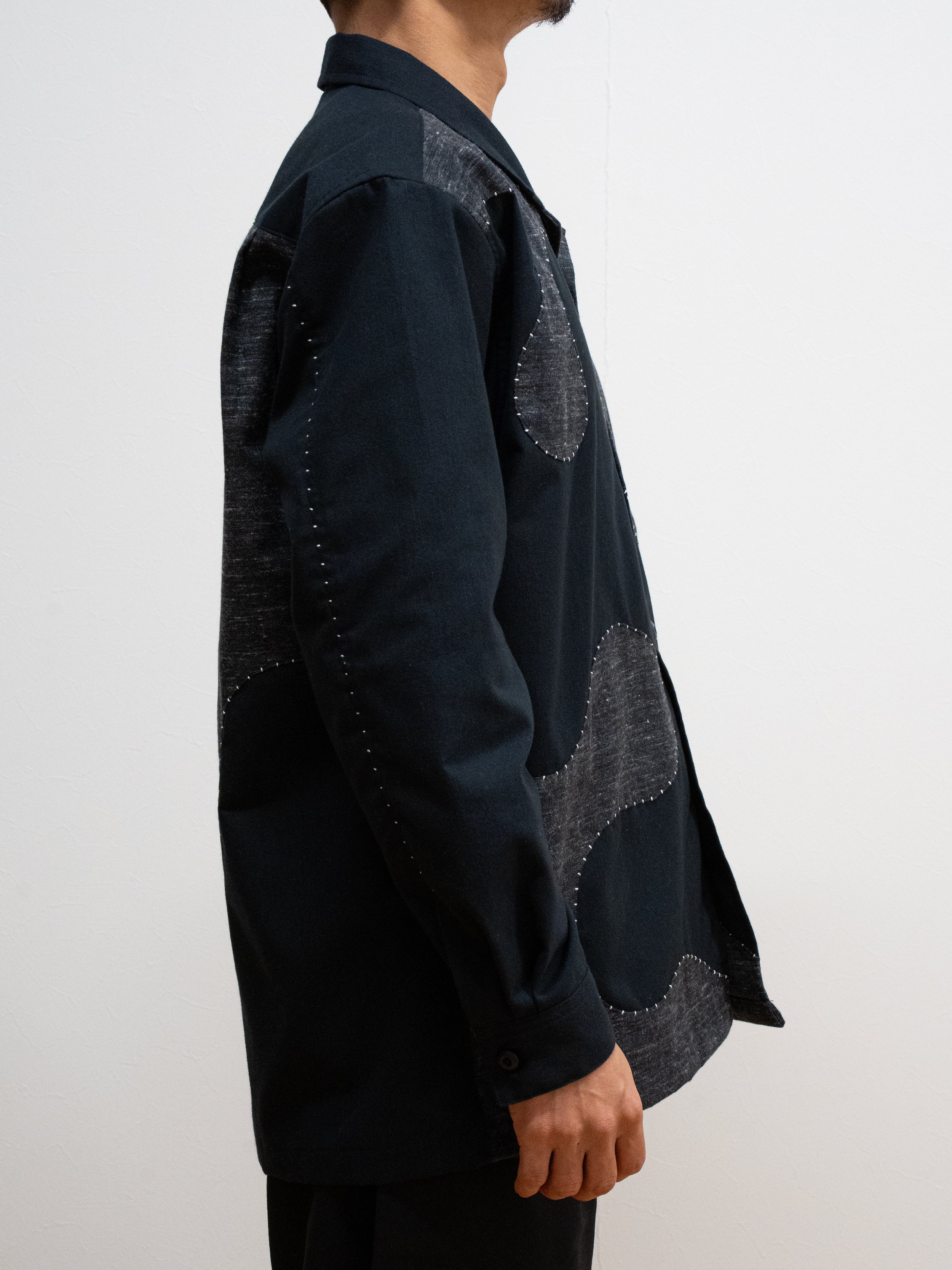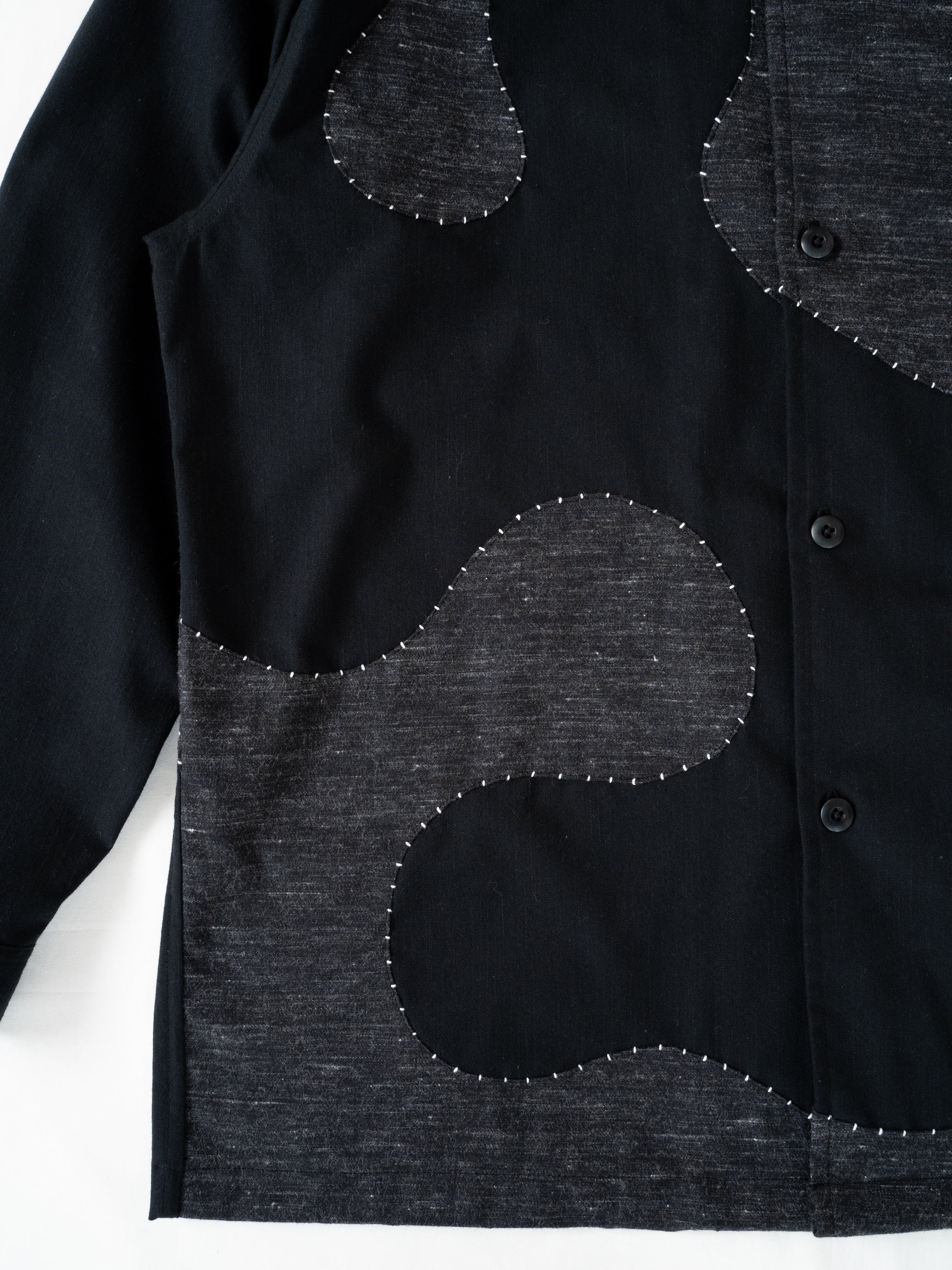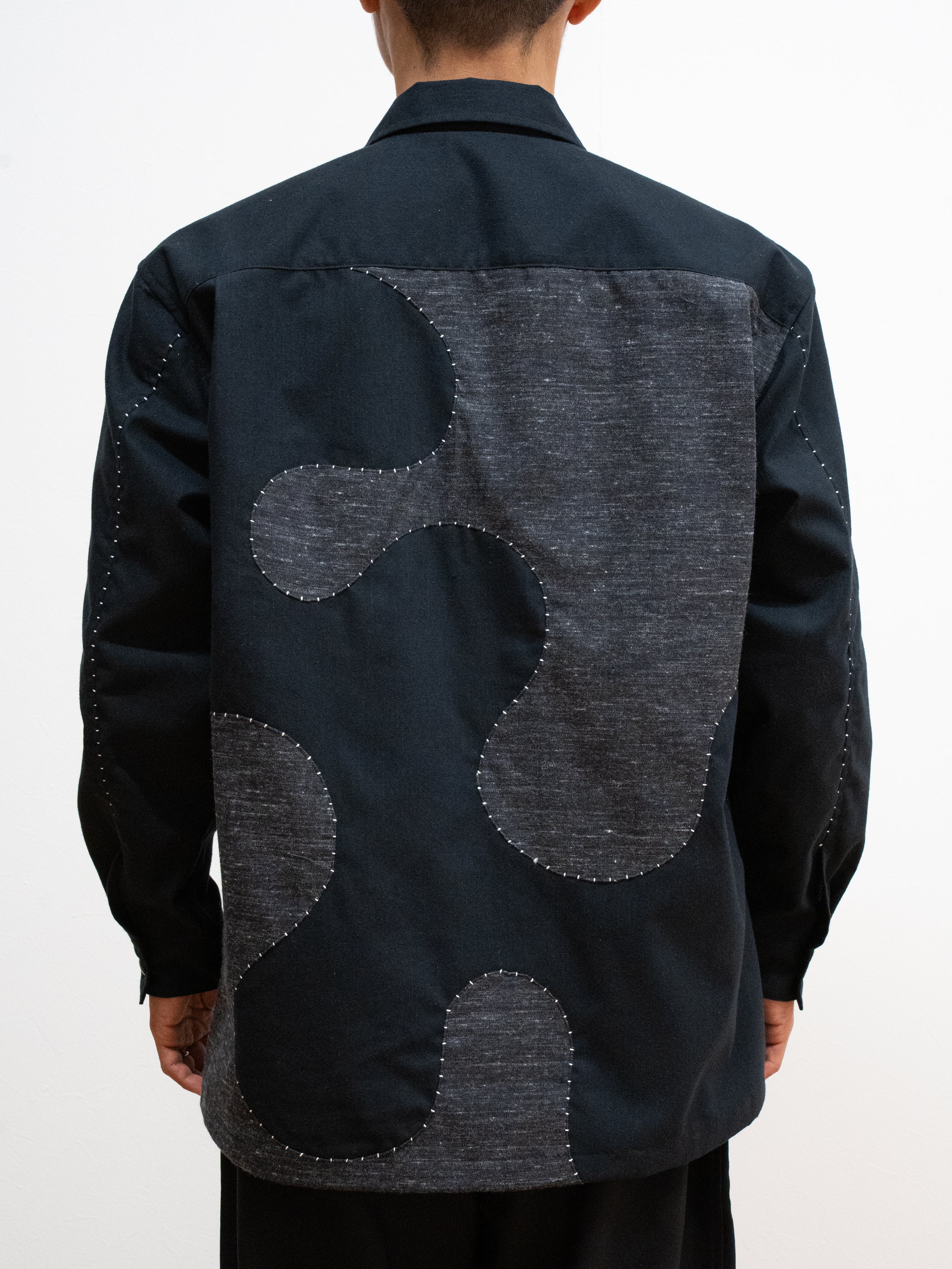 生地の織りあげから加工、縫製まで、すべてを自社工房で仕上げました。 ヴィンテージのシャトル式力織機で織り上げた生地を、表面のみ起毛加工したこの生地は、季節を問わずご着用でき、洗うほどに風合いが増していきます。フロントからバックにかけて大胆に走る曲線は、「波」をイメージしたもの。ハンドステッチで縁取ることで、立体感と温もりをプラスしました。一針一針を丁寧に縫い込んでいるため、同じものは二つと存在しない、まさに一点ものの特別な一枚です。