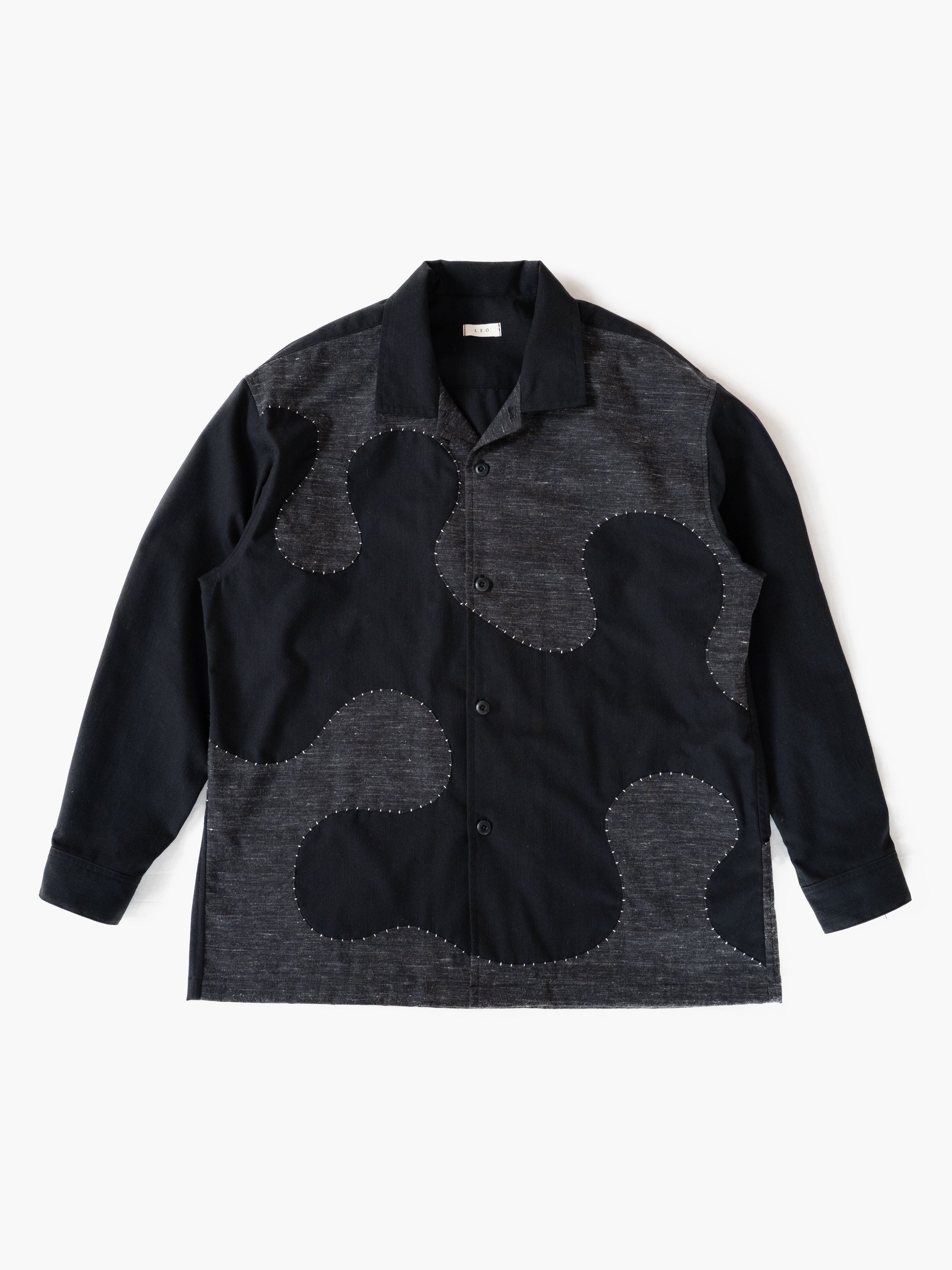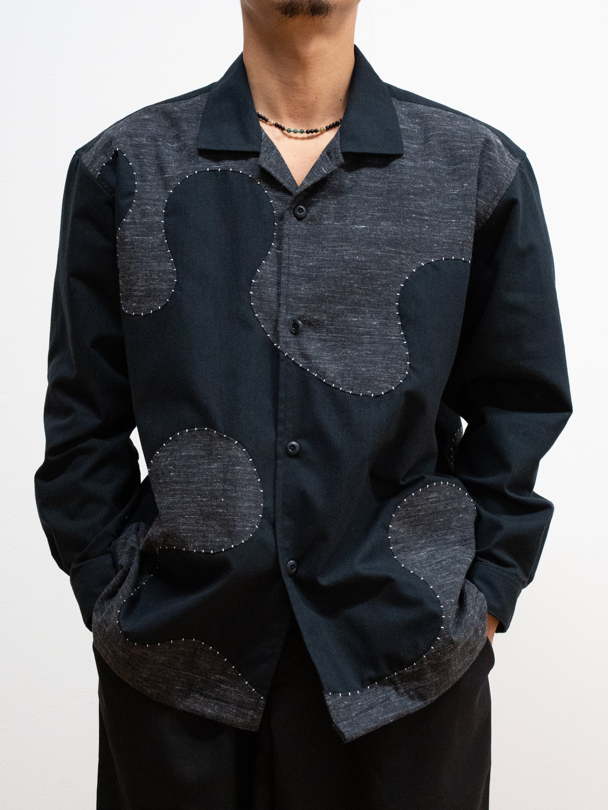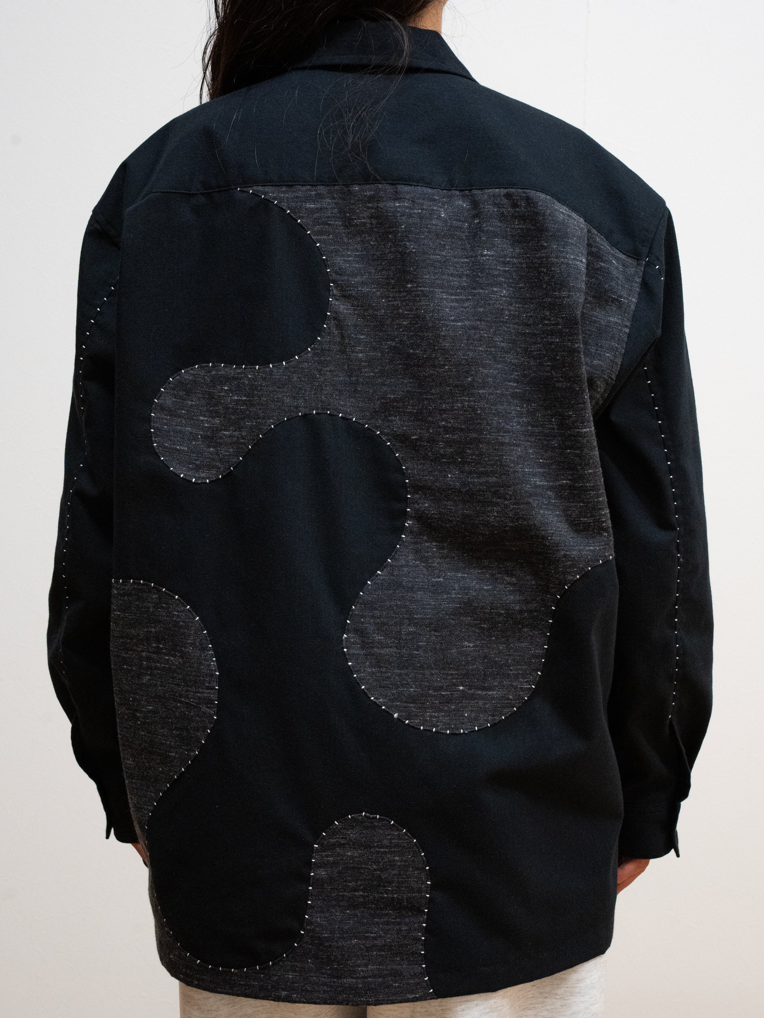 生地の織りあげから加工、縫製まで、すべてを自社工房で仕上げました。 ヴィンテージのシャトル式力織機で織り上げた生地を、表面のみ起毛加工したこの生地は、季節を問わずご着用でき、洗うほどに風合いが増していきます。フロントからバックにかけて大胆に走る曲線は、「波」をイメージしたもの。ハンドステッチで縁取ることで、立体感と温もりをプラスしました。一針一針を丁寧に縫い込んでいるため、同じものは二つと存在しない、まさに一点ものの特別な一枚です。