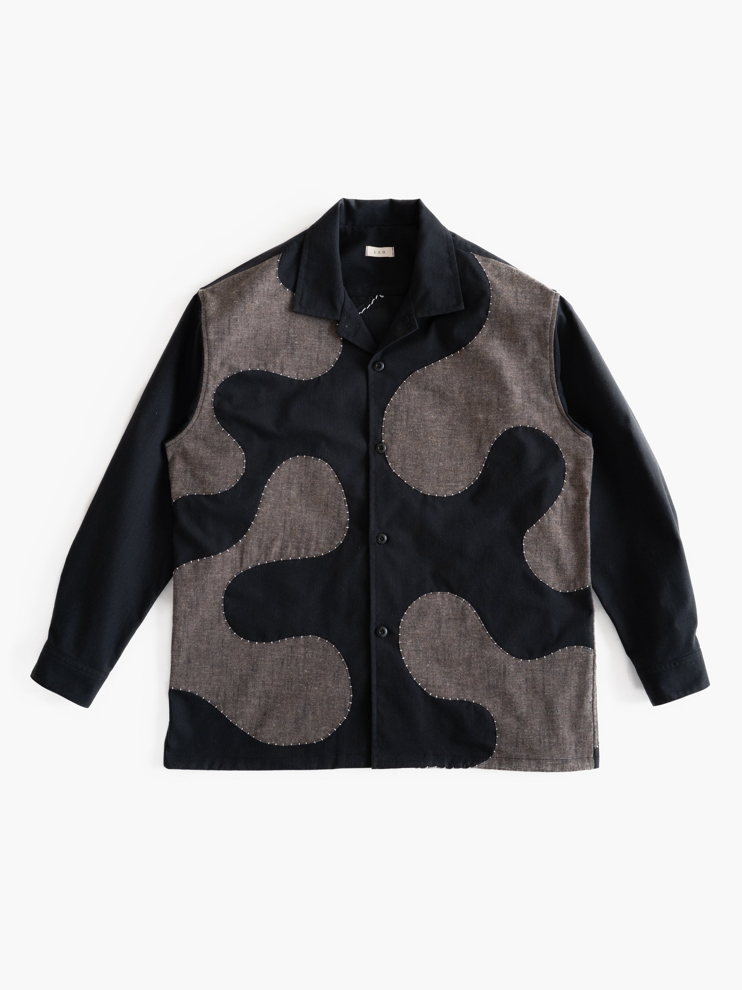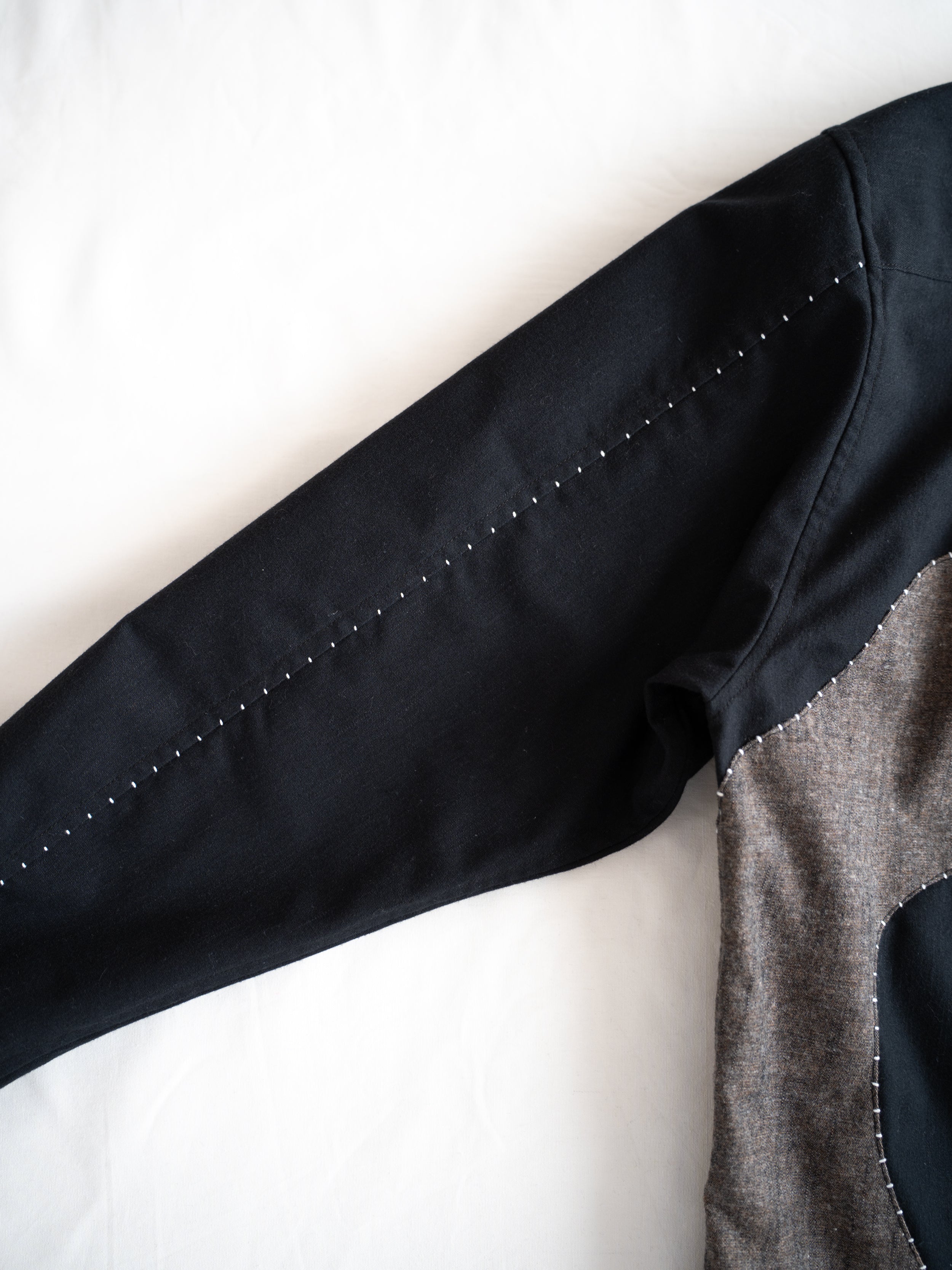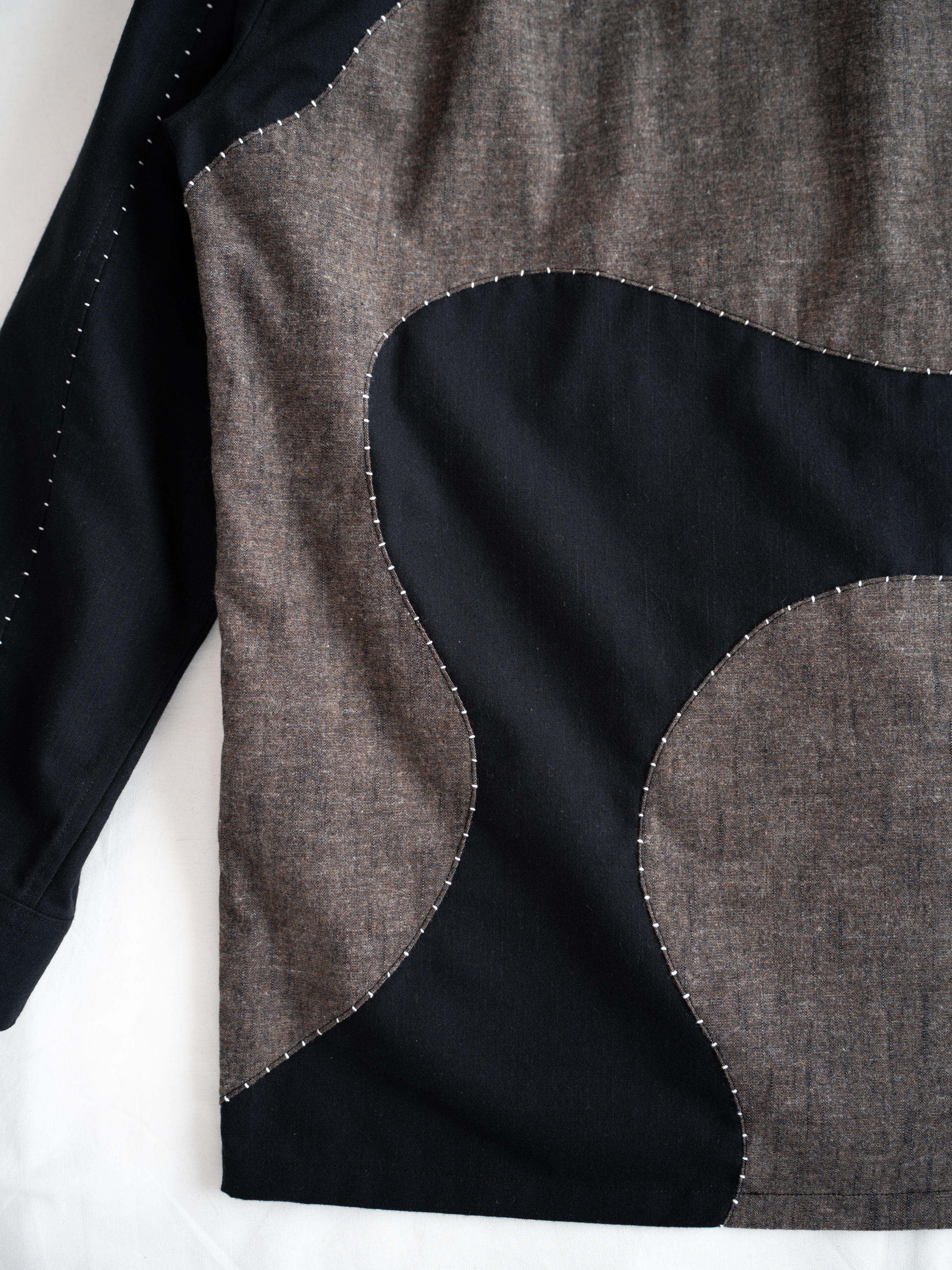 生地の織りあげから加工、縫製まで、すべてを自社工房で仕上げました。 ヴィンテージのシャトル式力織機で織り上げた生地を、表面のみ起毛加工したこの生地は、季節を問わずご着用でき、洗うほどに風合いが増していきます。フロントからバックにかけて大胆に走る曲線は、「波」をイメージしたもの。ハンドステッチで縁取ることで、立体感と温もりをプラスしました。一針一針を丁寧に縫い込んでいるため、同じものは二つと存在しない、まさに一点ものの特別な一枚です。