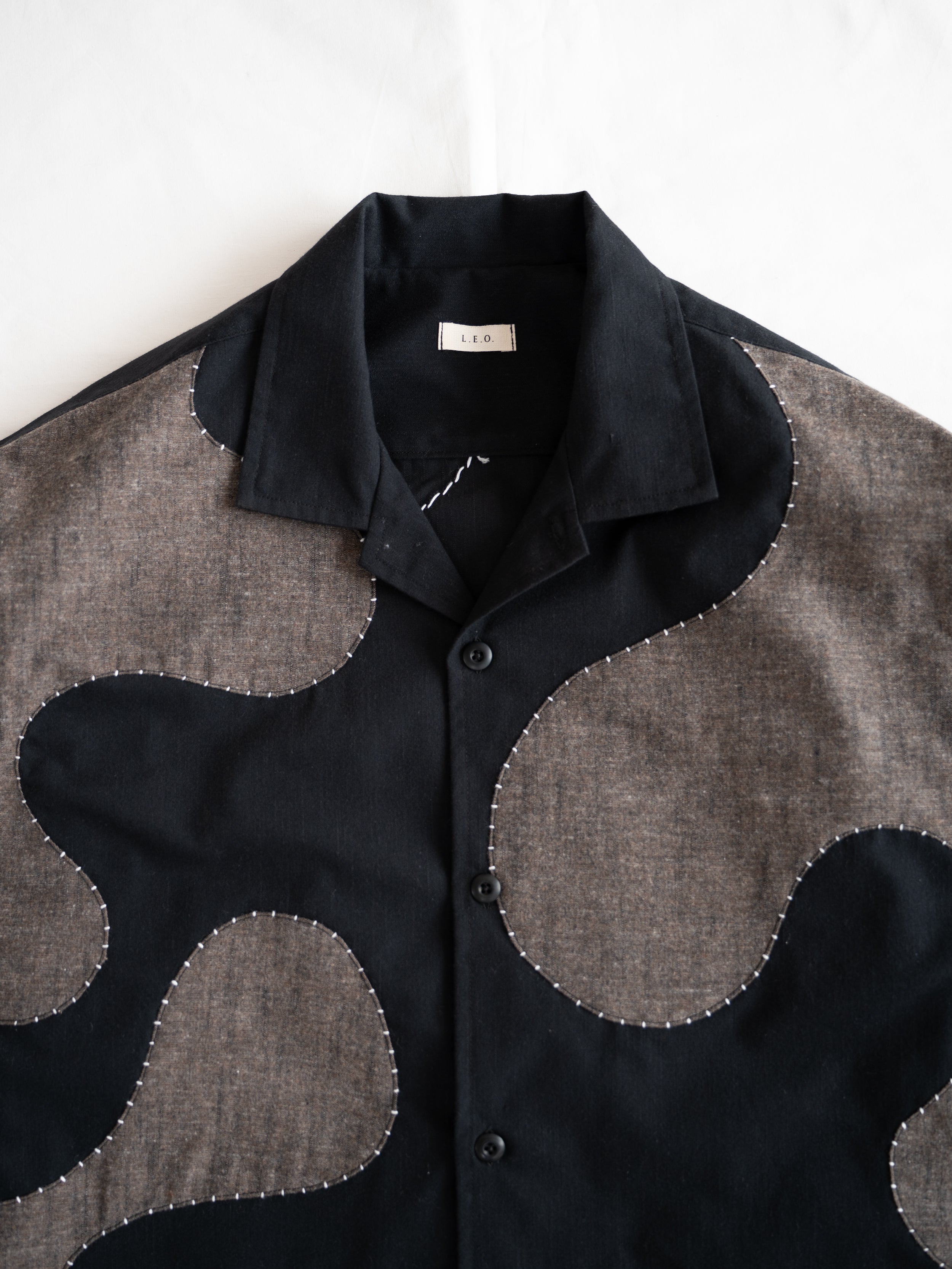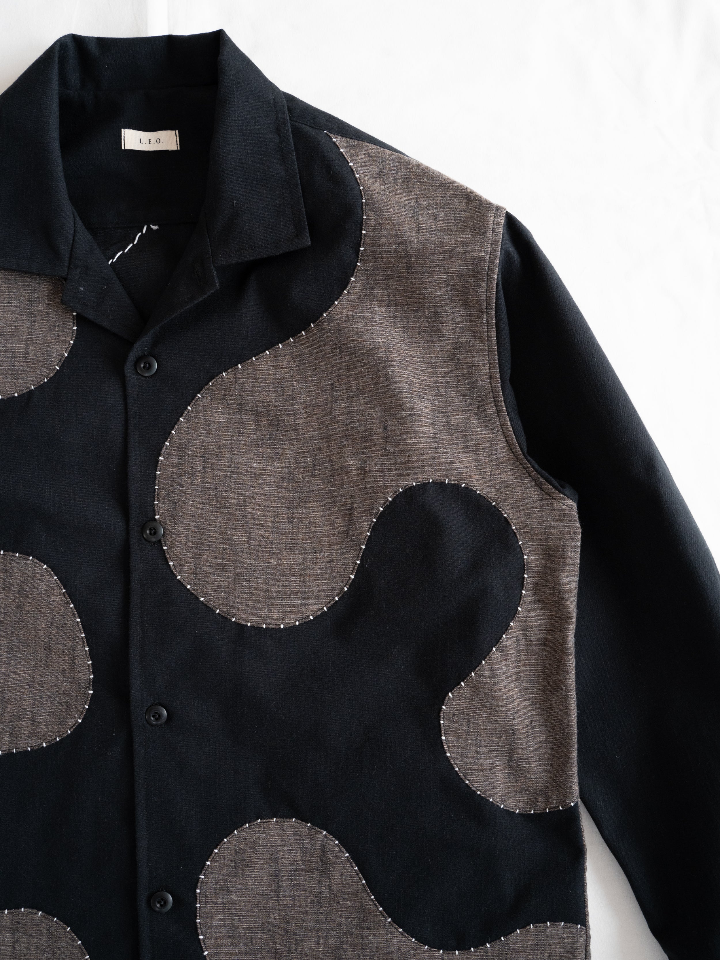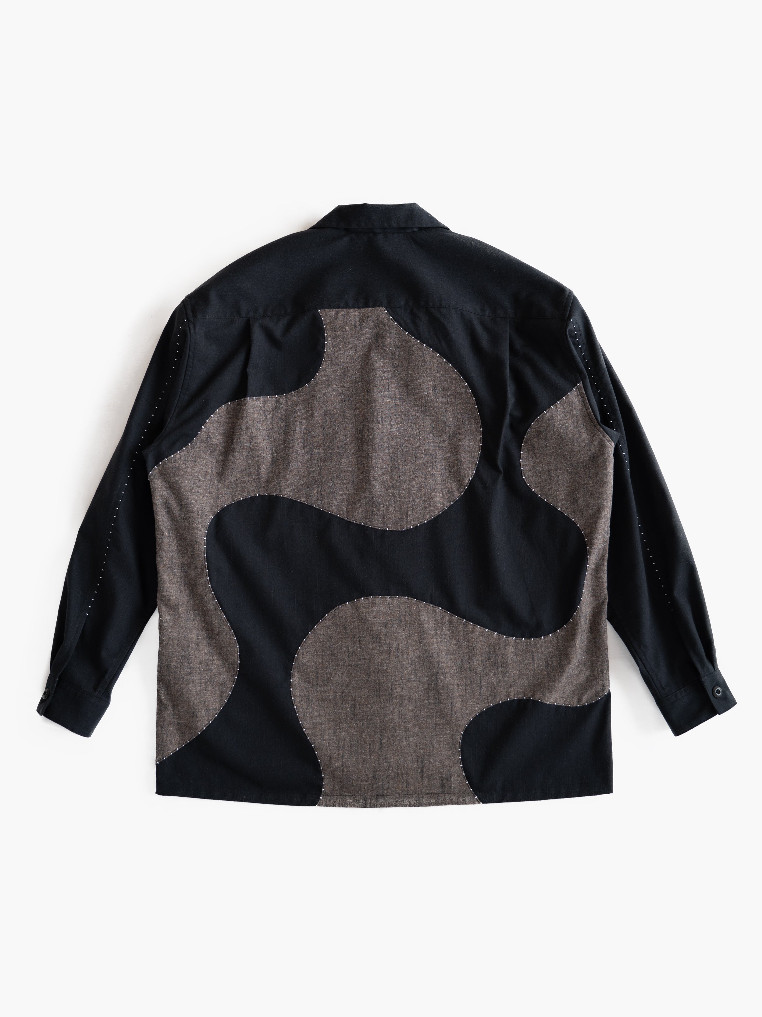 生地の織りあげから加工、縫製まで、すべてを自社工房で仕上げました。 ヴィンテージのシャトル式力織機で織り上げた生地を、表面のみ起毛加工したこの生地は、季節を問わずご着用でき、洗うほどに風合いが増していきます。フロントからバックにかけて大胆に走る曲線は、「波」をイメージしたもの。ハンドステッチで縁取ることで、立体感と温もりをプラスしました。一針一針を丁寧に縫い込んでいるため、同じものは二つと存在しない、まさに一点ものの特別な一枚です。