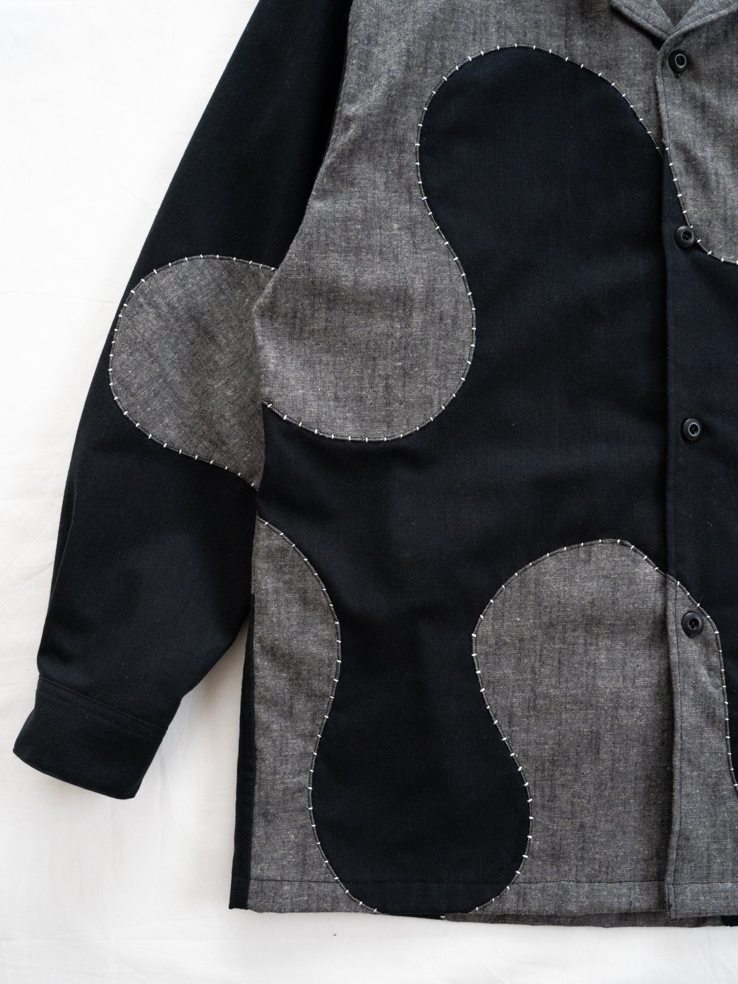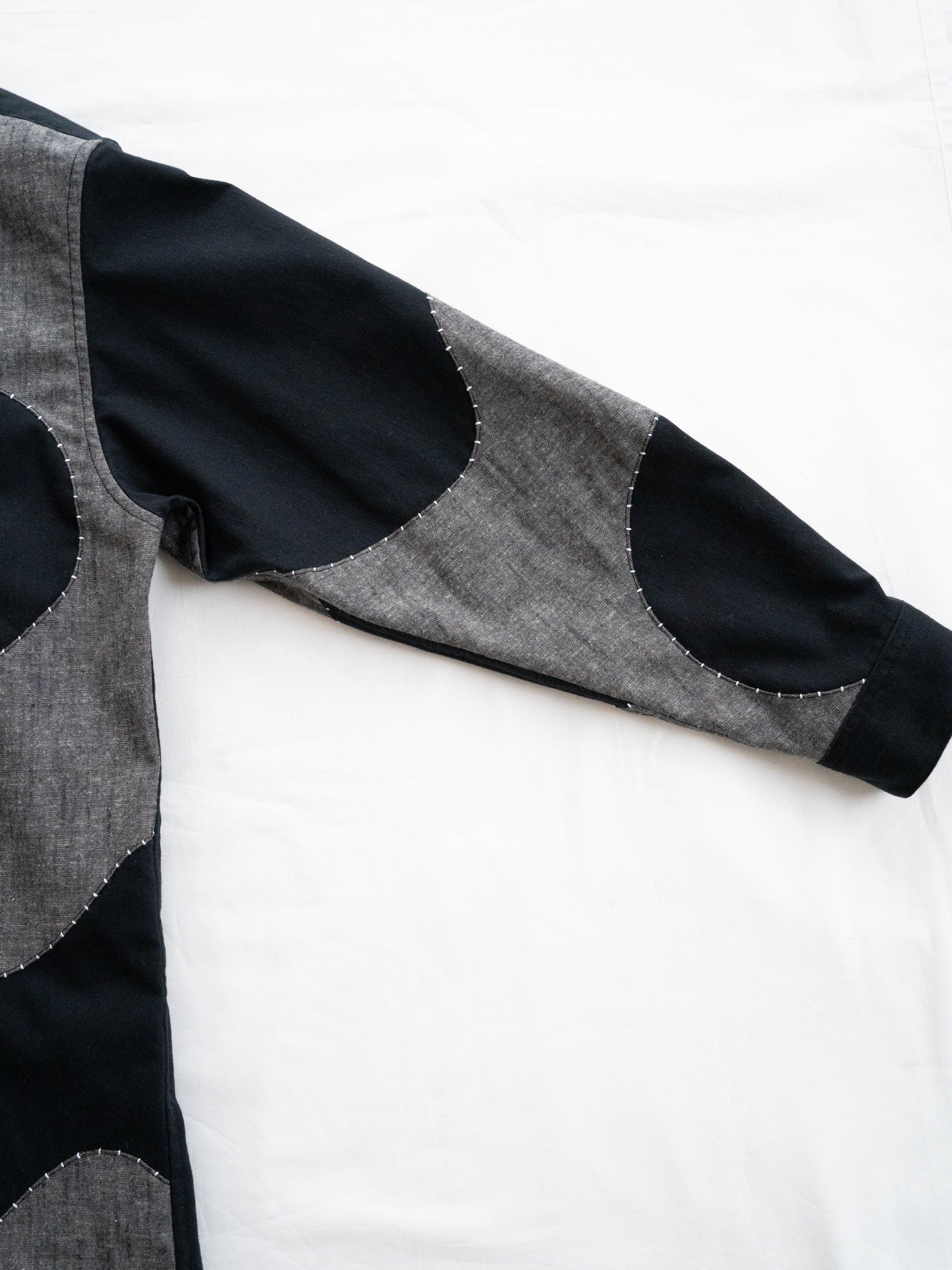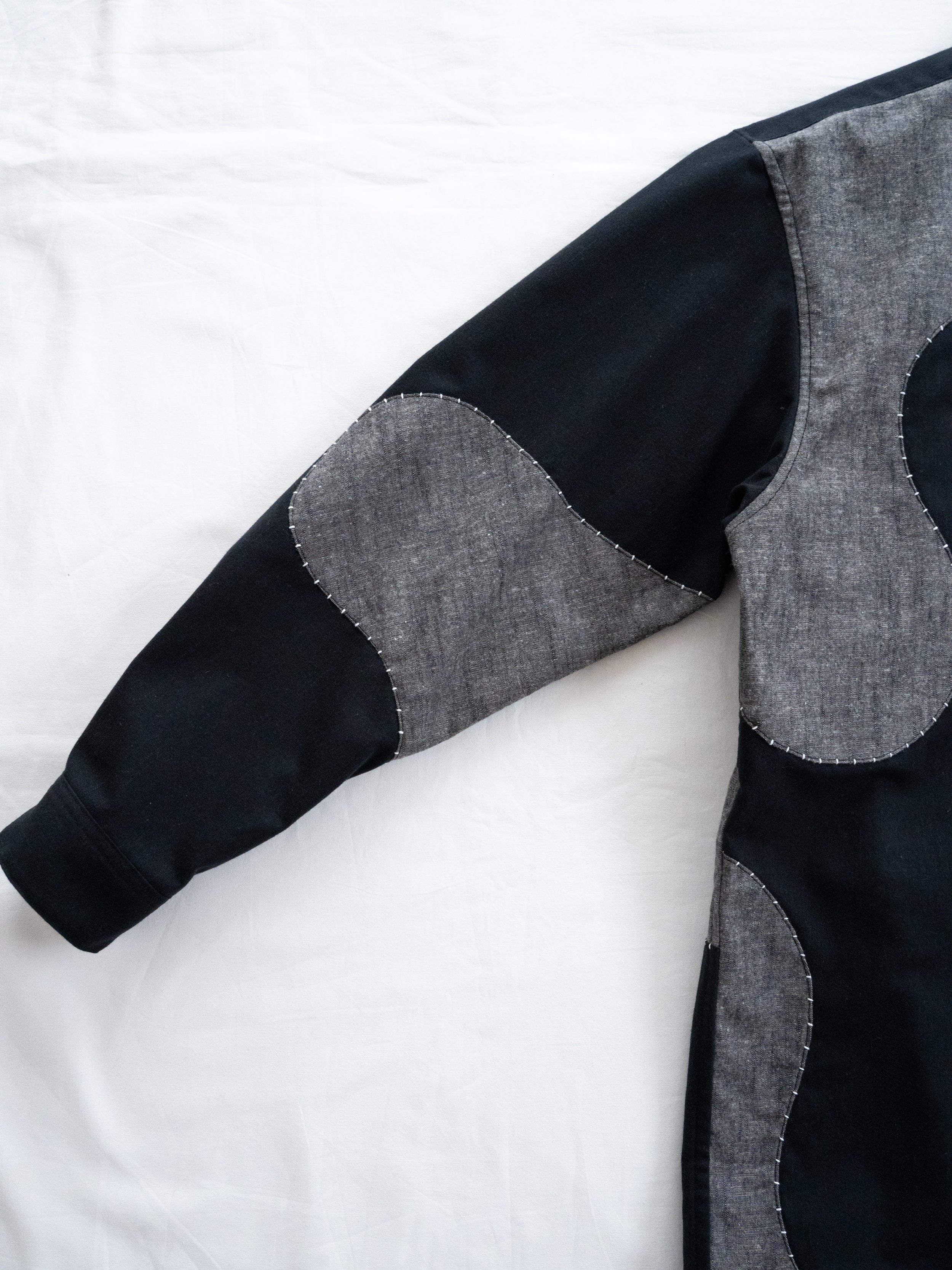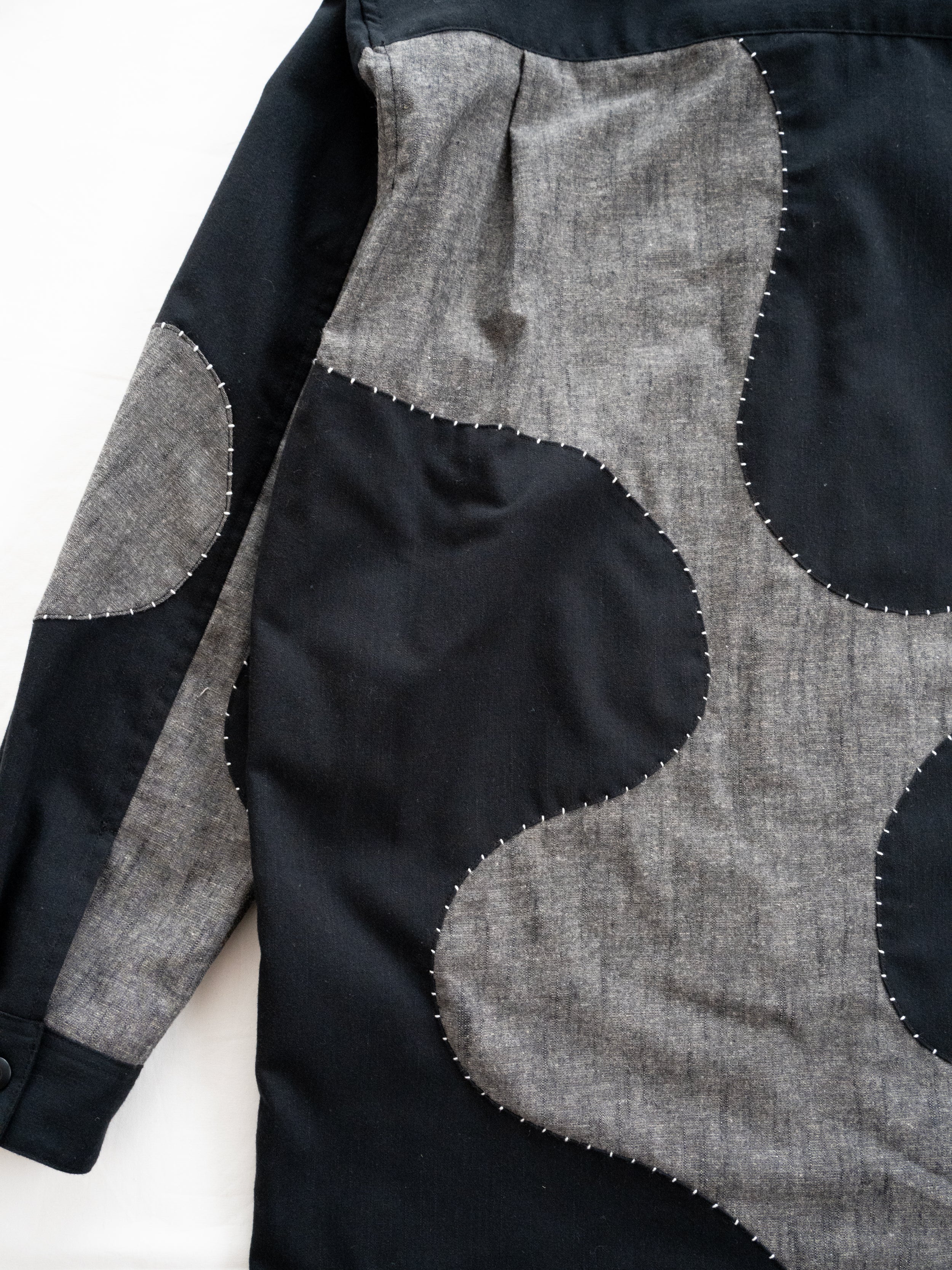 生地の織りあげから加工、縫製まで、すべてを自社工房で仕上げました。 ヴィンテージのシャトル式力織機で織り上げた生地を、表面のみ起毛加工したこの生地は、季節を問わずご着用でき、洗うほどに風合いが増していきます。フロントからバックにかけて大胆に走る曲線は、「波」をイメージしたもの。ハンドステッチで縁取ることで、立体感と温もりをプラスしました。一針一針を丁寧に縫い込んでいるため、同じものは二つと存在しない、まさに一点ものの特別な一枚です。