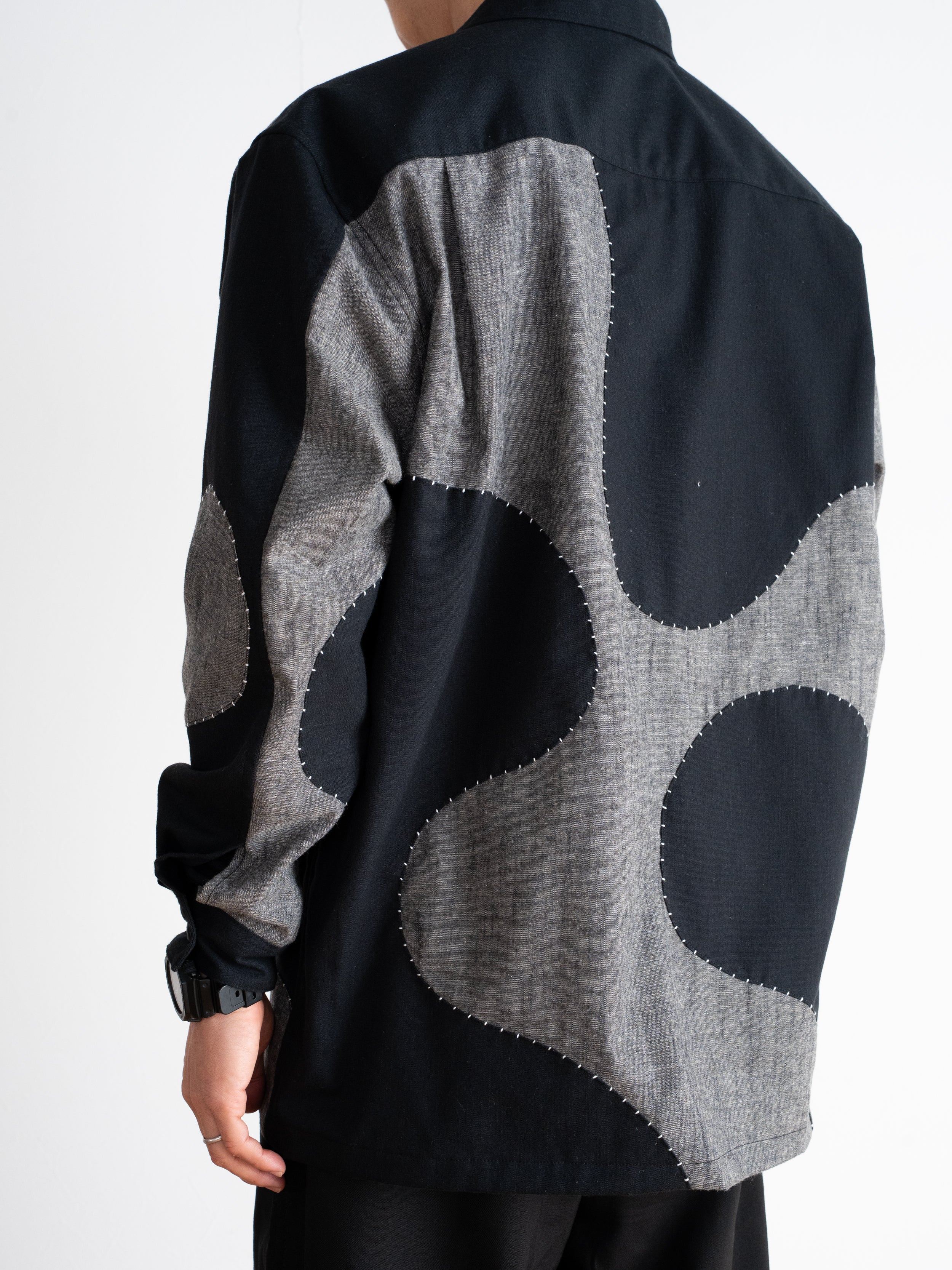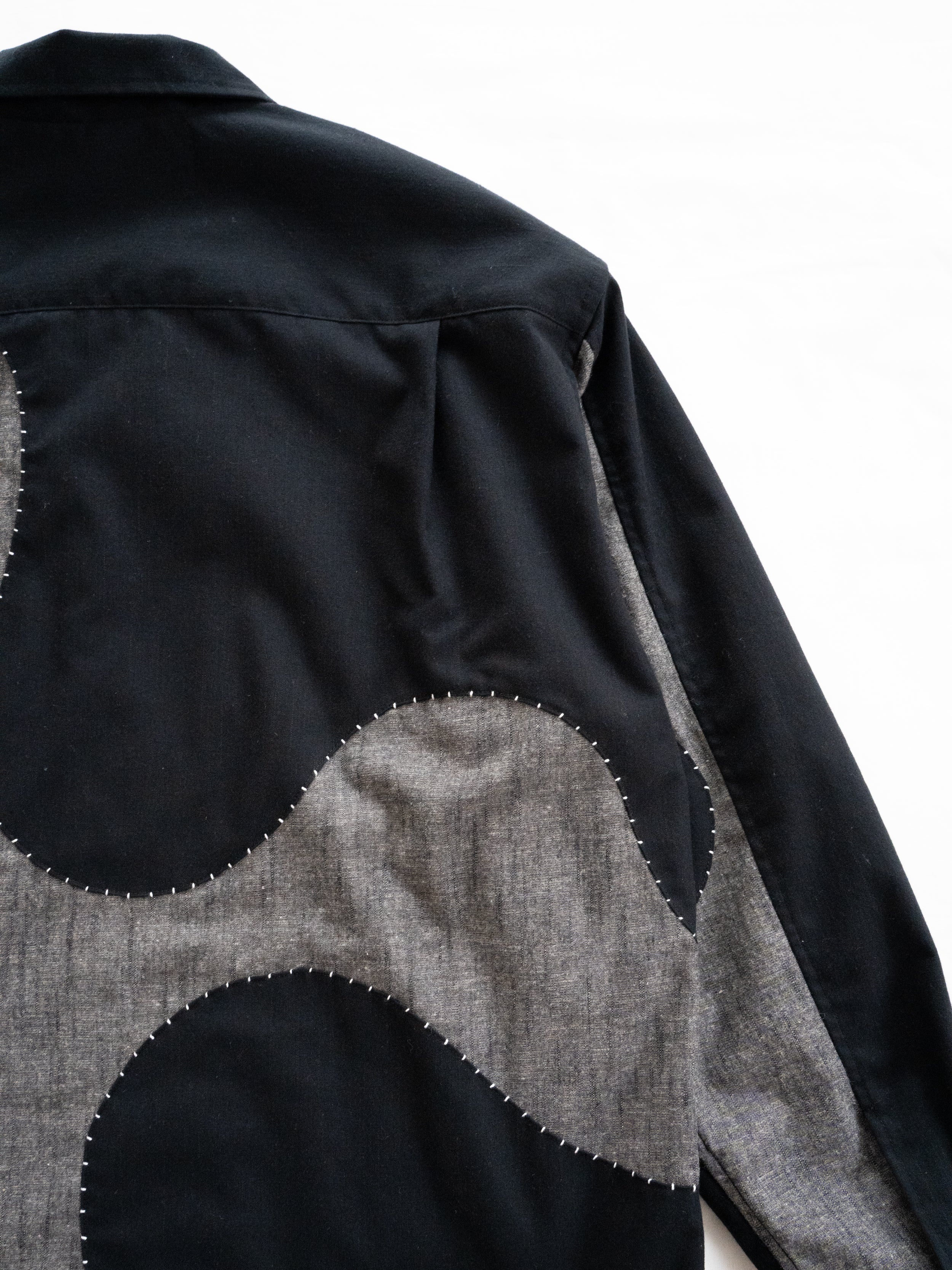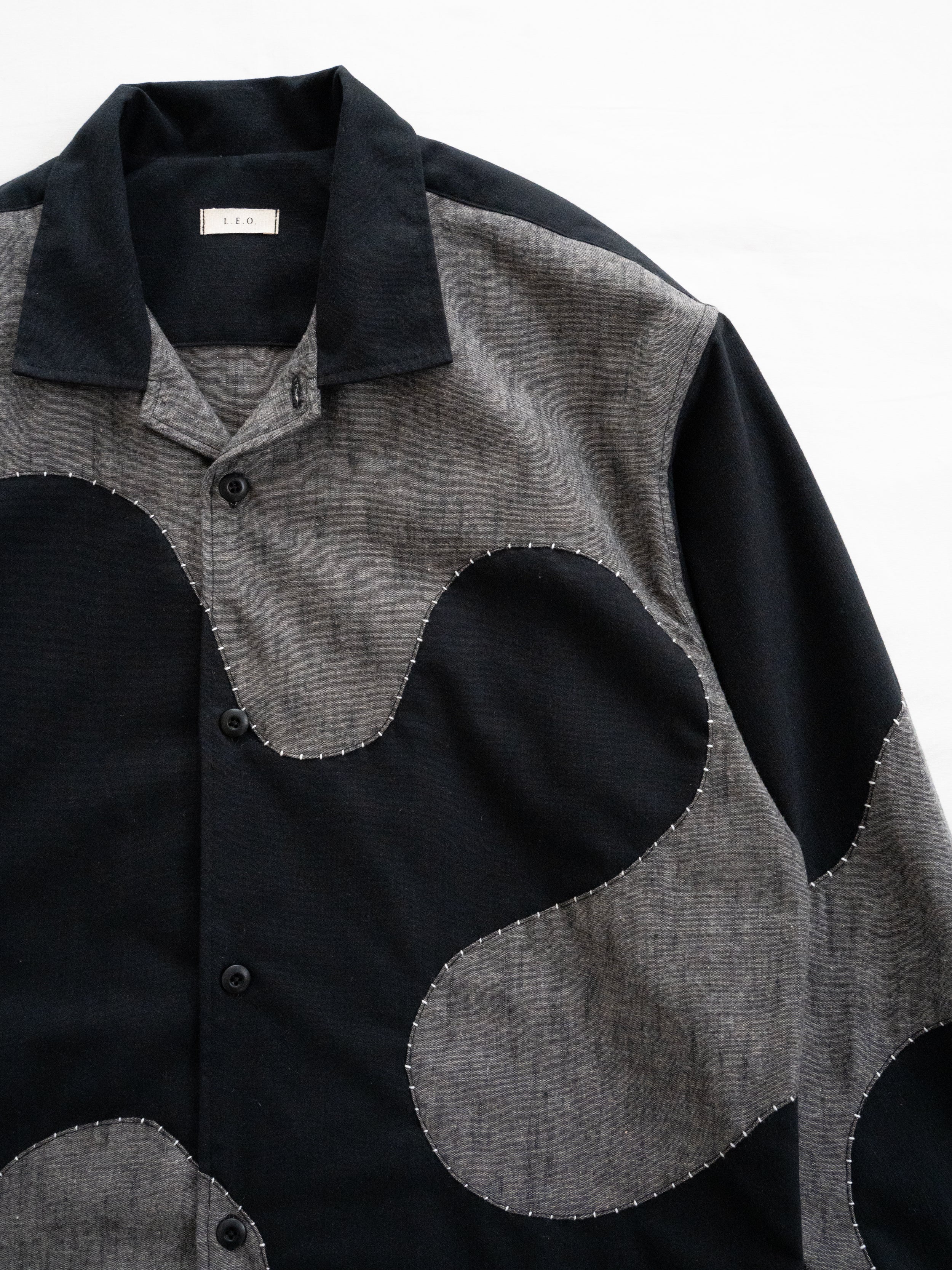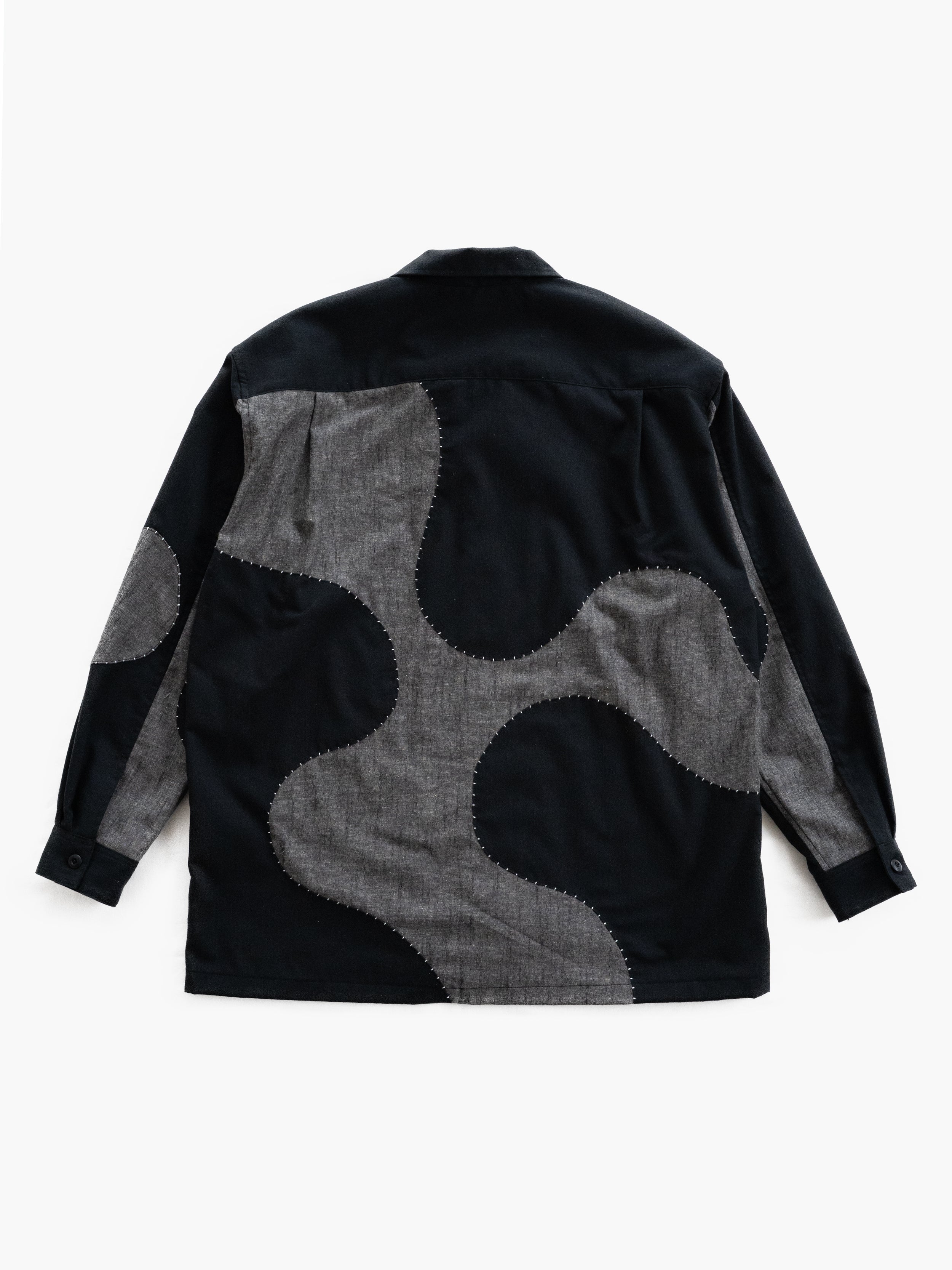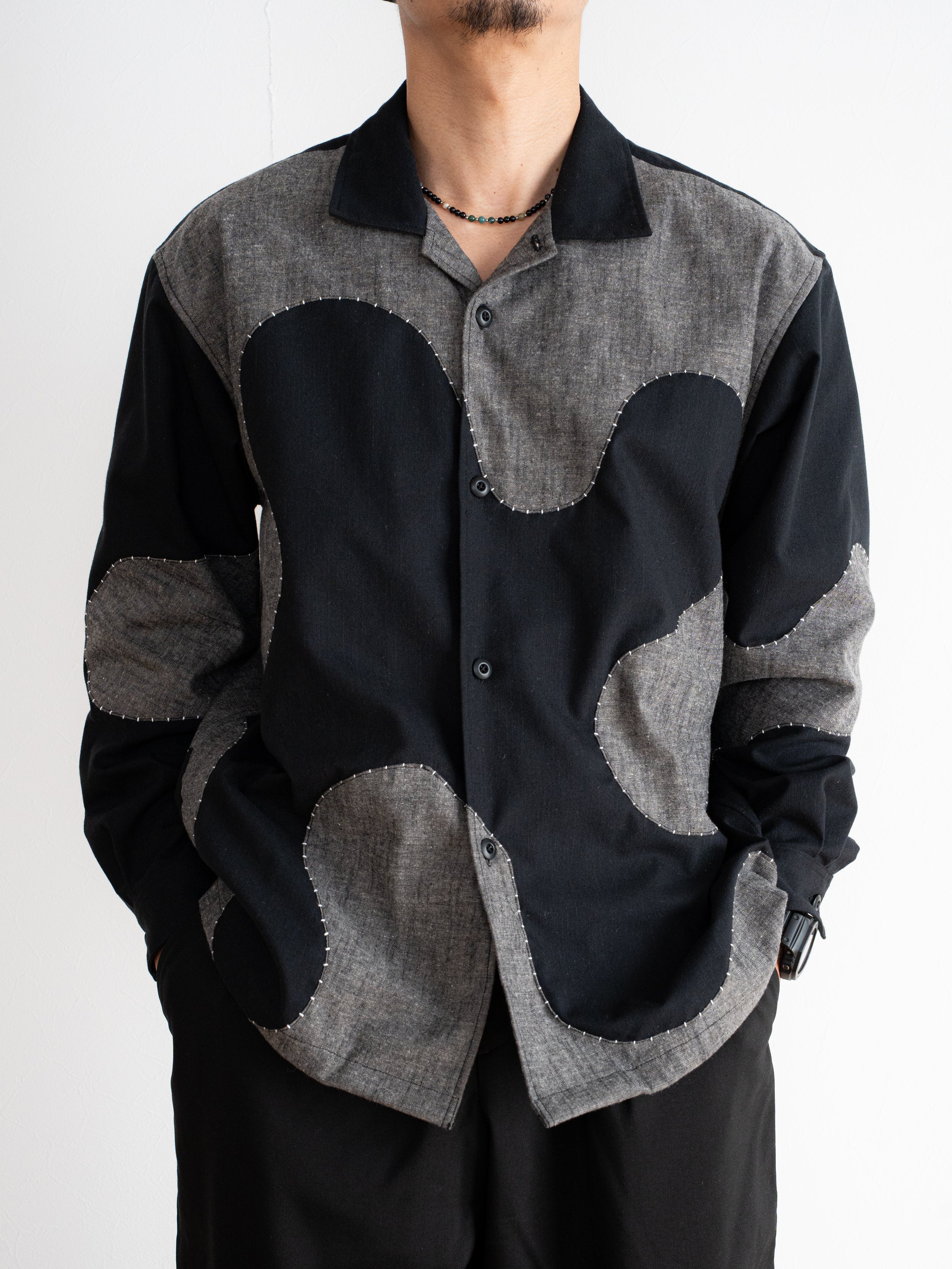 生地の織りあげから加工、縫製まで、すべてを自社工房で仕上げました。 ヴィンテージのシャトル式力織機で織り上げた生地を、表面のみ起毛加工したこの生地は、季節を問わずご着用でき、洗うほどに風合いが増していきます。フロントからバックにかけて大胆に走る曲線は、「波」をイメージしたもの。ハンドステッチで縁取ることで、立体感と温もりをプラスしました。一針一針を丁寧に縫い込んでいるため、同じものは二つと存在しない、まさに一点ものの特別な一枚です。