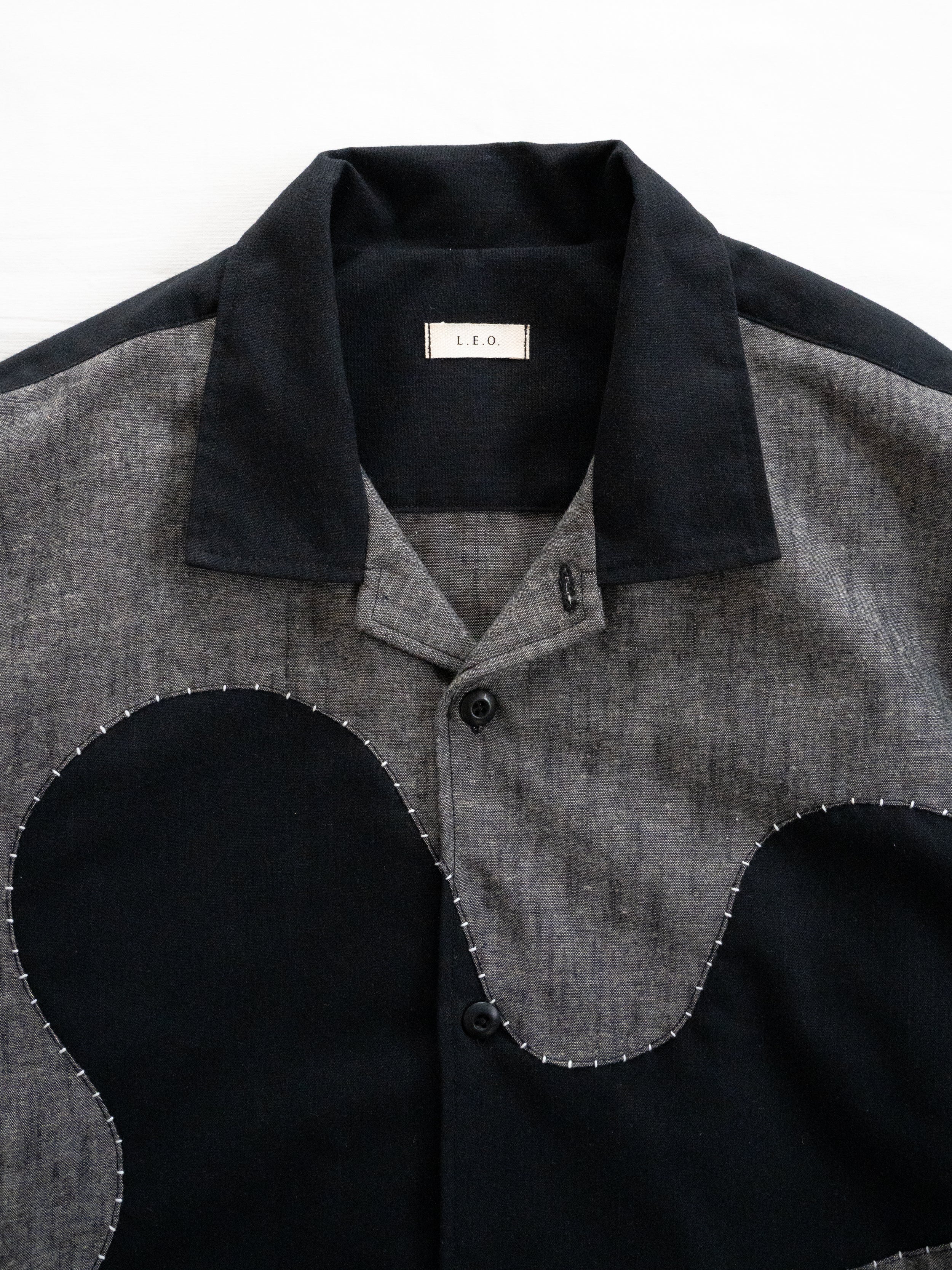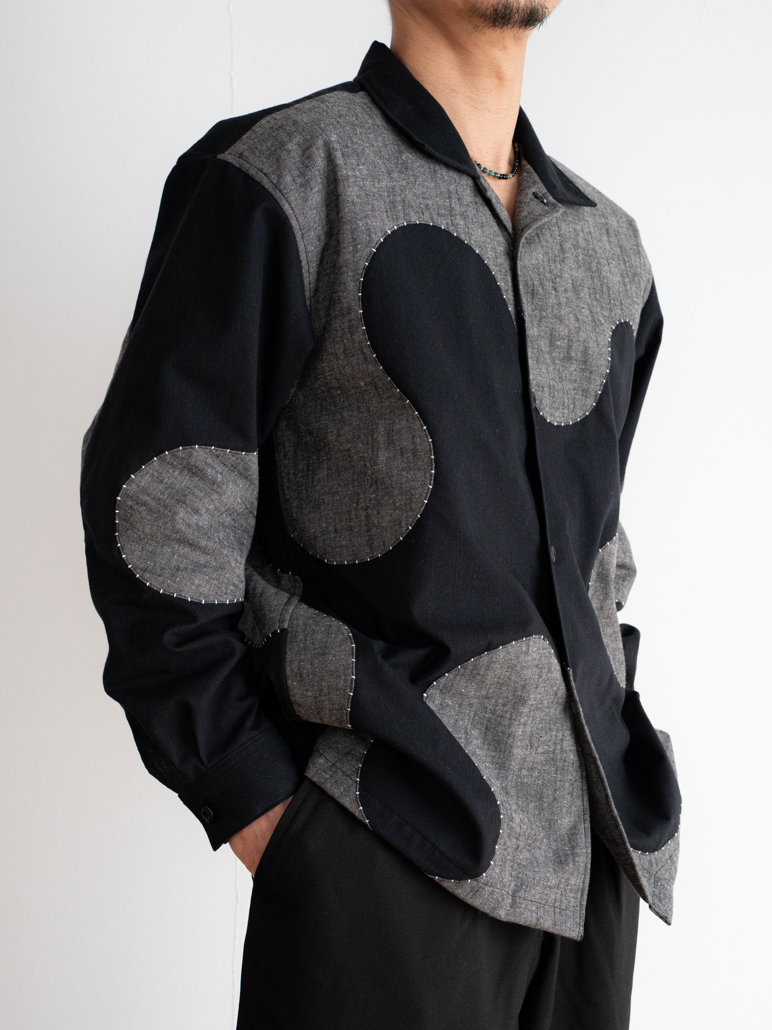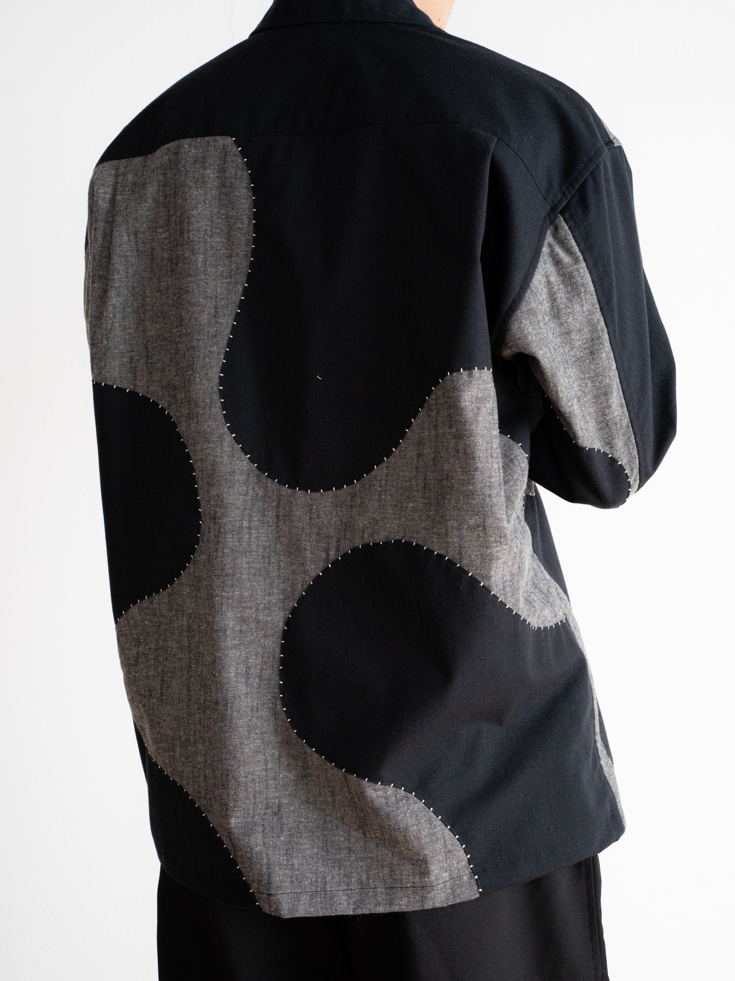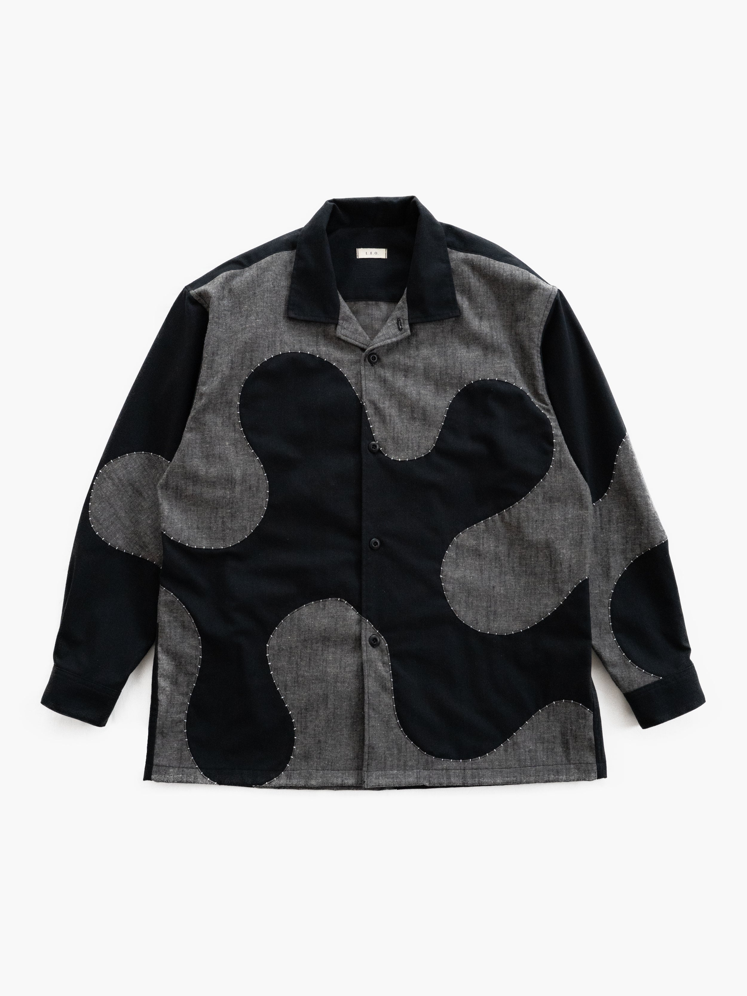 生地の織りあげから加工、縫製まで、すべてを自社工房で仕上げました。 ヴィンテージのシャトル式力織機で織り上げた生地を、表面のみ起毛加工したこの生地は、季節を問わずご着用でき、洗うほどに風合いが増していきます。フロントからバックにかけて大胆に走る曲線は、「波」をイメージしたもの。ハンドステッチで縁取ることで、立体感と温もりをプラスしました。一針一針を丁寧に縫い込んでいるため、同じものは二つと存在しない、まさに一点ものの特別な一枚です。