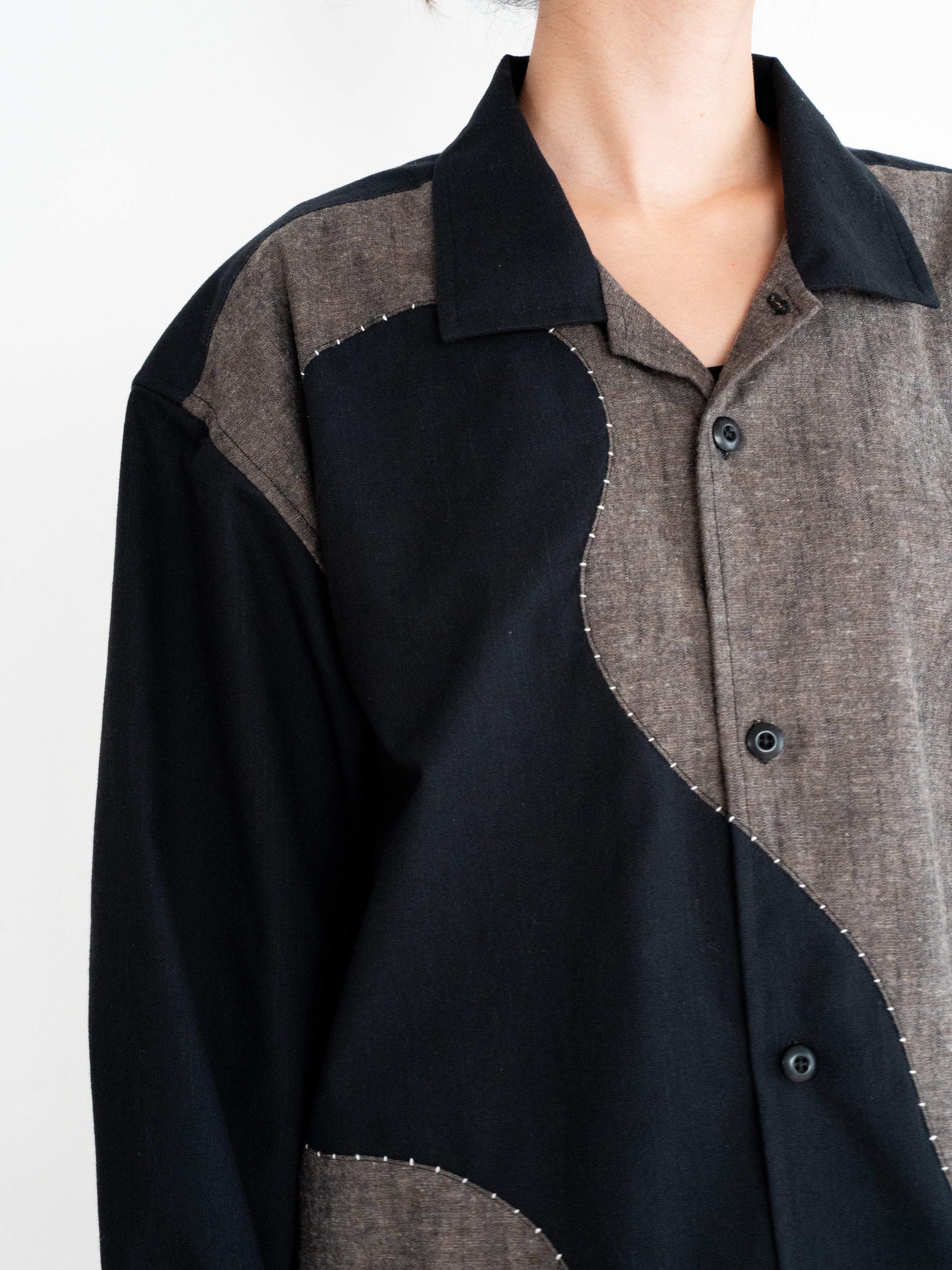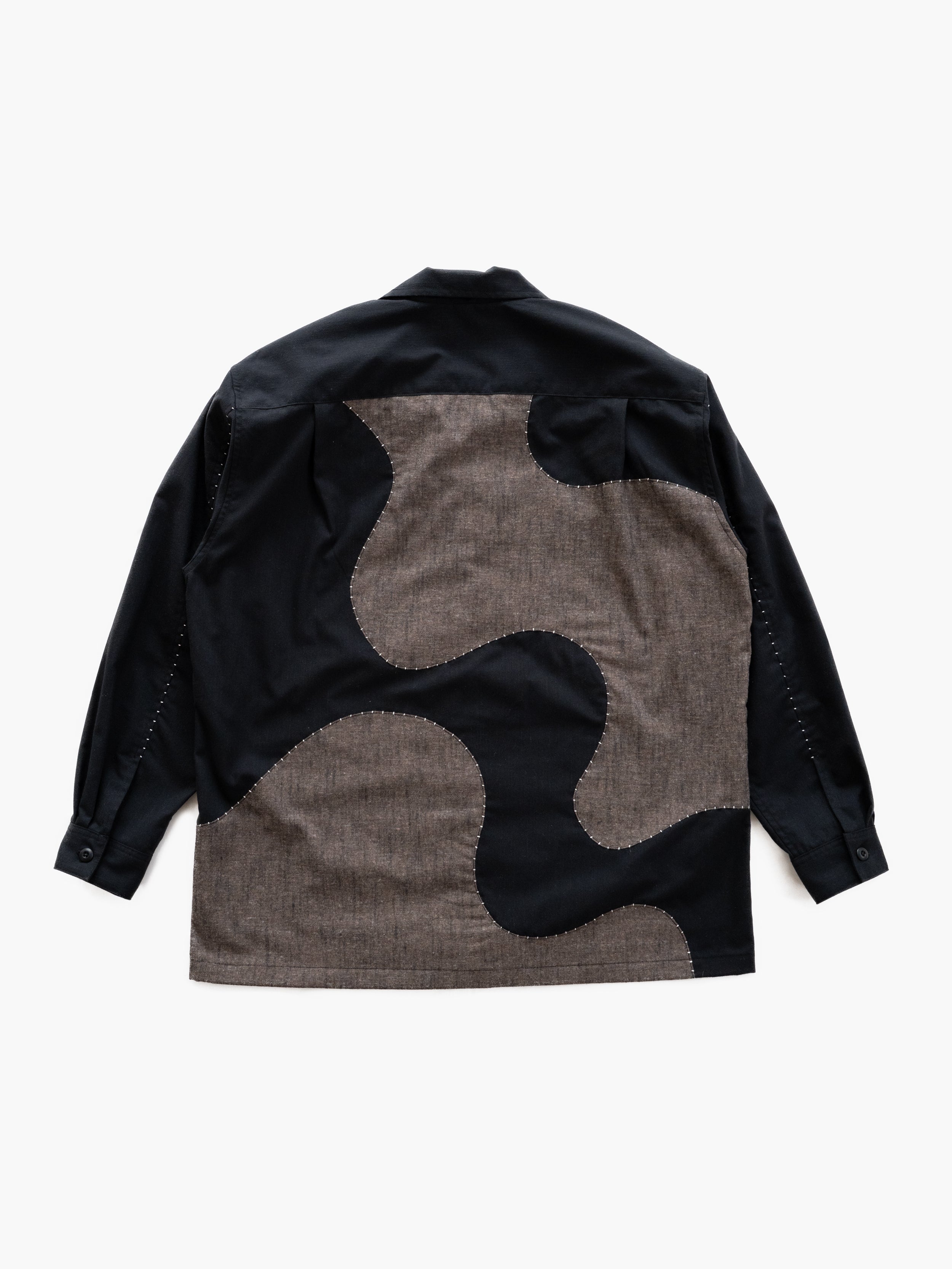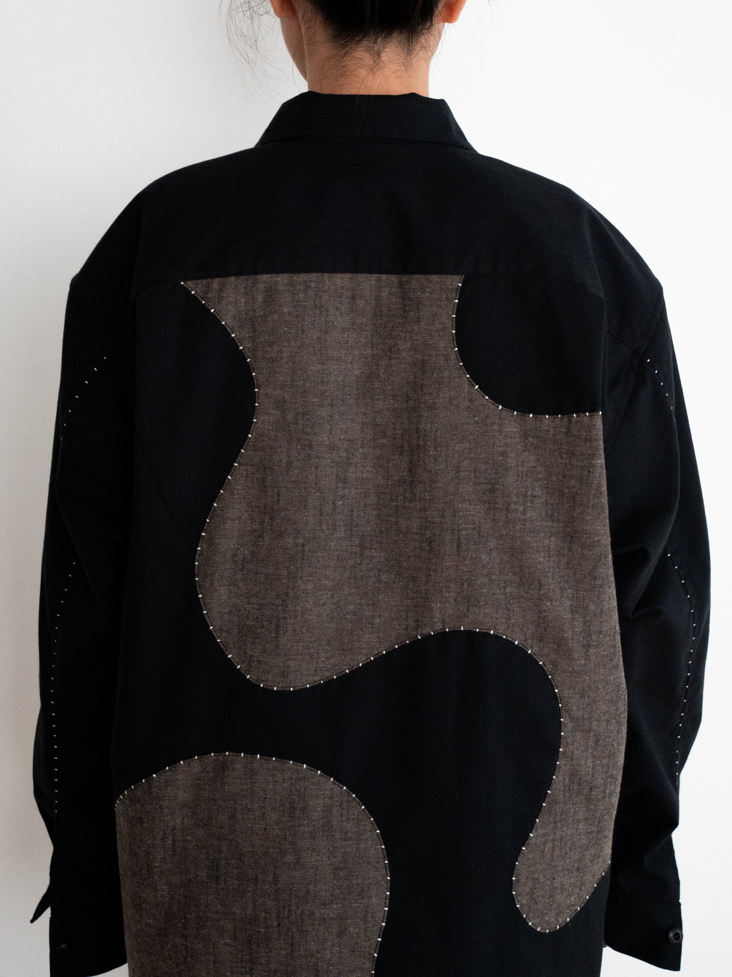 生地の織りあげから加工、縫製まで、すべてを自社工房で仕上げたオリジナルのシャツです。 素材は肌ざわりの良い綿100%。季節を問わず快適に着られ、洗うほどに風合いが増していきます。フロントからバックにかけて大胆に走る曲線は、日本の伝統的な「波」をイメージしたもの。刺し子ステッチで縁取ることで、立体感と温もりをプラスしました。一針一針を丁寧に縫い込んでいるため、同じものは二つと存在しない、まさに一点ものの特別な一枚です。